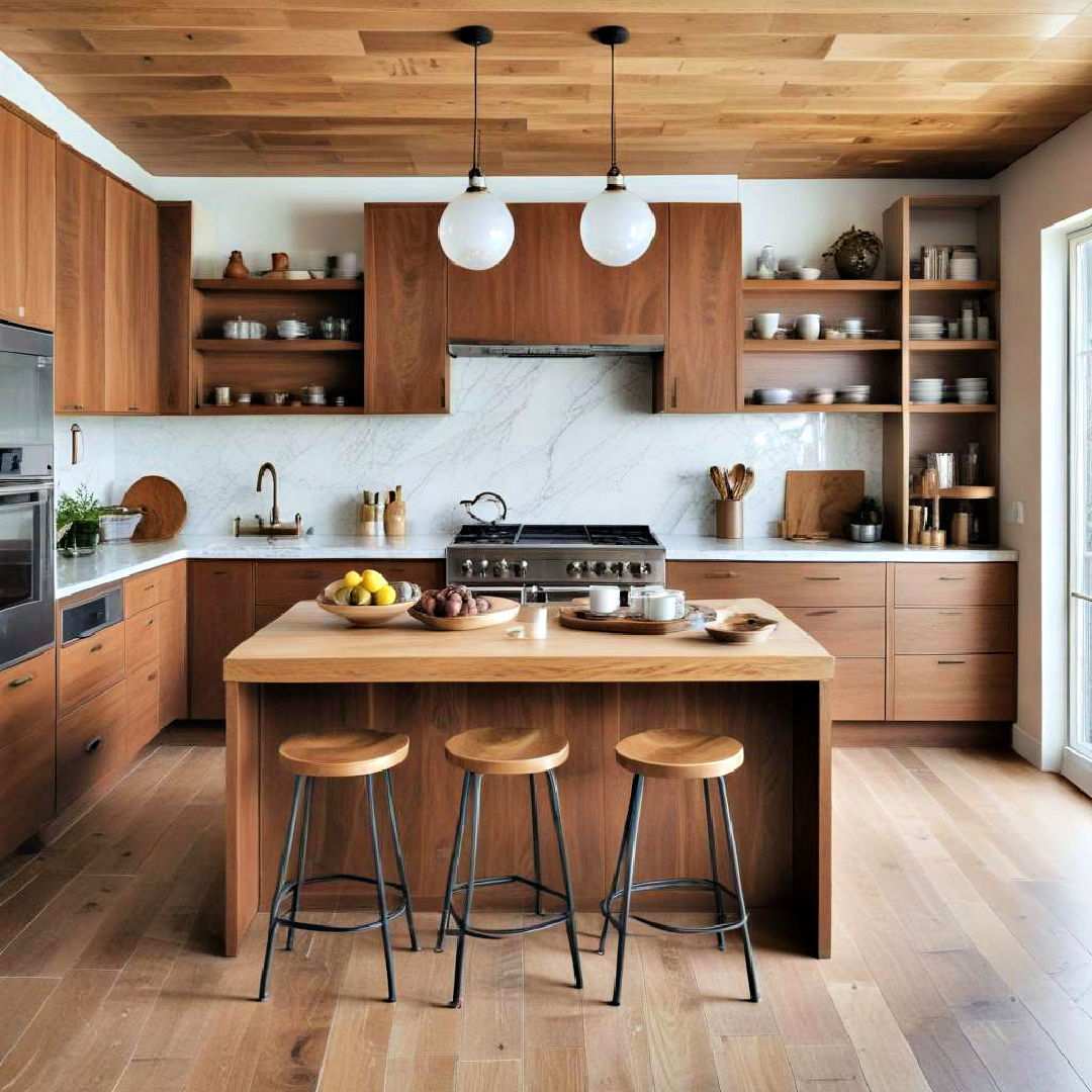 Walnut wood shelving can introduce a warm, natural element to your kitchen, adding a touch of coziness to the space. The rich brown tones of walnut work beautifully against white or neutral walls, creating a focal point without overwhelming the space. Use these shelves to display dishware or decorative items, adding both functionality and a stylish touch. Walnut’s durability and deep color make it a versatile choice for kitchens aiming for a cozy, modern look, where its natural beauty can shine.