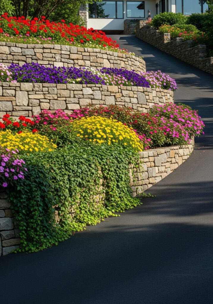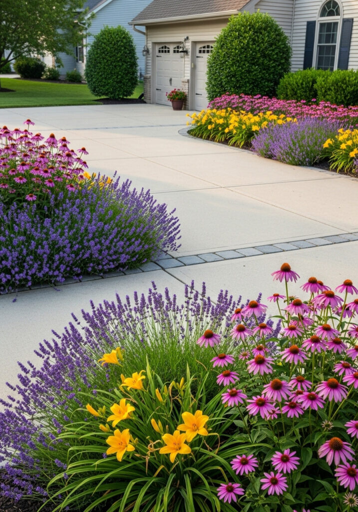 Framing your driveway with flower beds adds instant charm and seasonal color. Perennials like daylilies, lavender, and coneflowers provide lasting blooms, while annuals can be rotated for variety. Edging the beds with stone or brick keeps soil in place and creates a polished boundary.