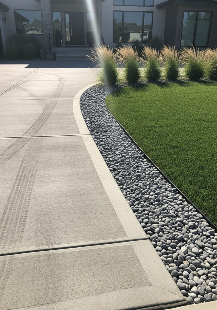 A gravel strip between the driveway and lawn serves both function and design. It prevents grass from encroaching, allows rainwater drainage, and adds textural contrast. Colored gravel can complement the tones of your home or other landscaping features.