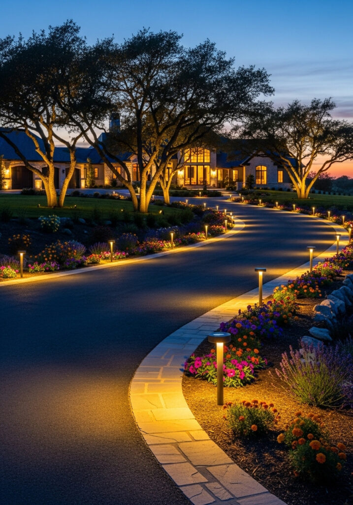 Driveway lighting improves safety and highlights landscaping features. Solar stake lights, low-voltage path lights, or uplighting for trees create ambiance at night. Strategically placed lights can emphasize curves, direct drivers, and make the entrance feel more inviting.