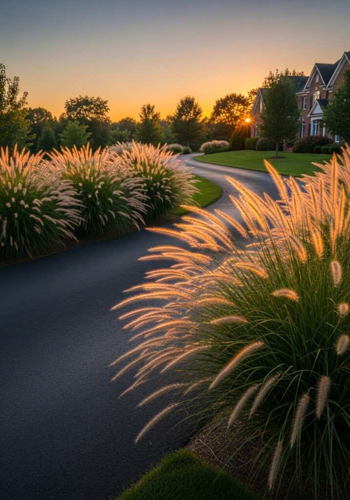 Tall, swaying grasses add softness and texture to driveway borders. Varieties like fountain grass, miscanthus, or feather reed grass bring vertical accents that look beautiful in clusters. They are low-maintenance and thrive through fall, adding movement with every breeze.