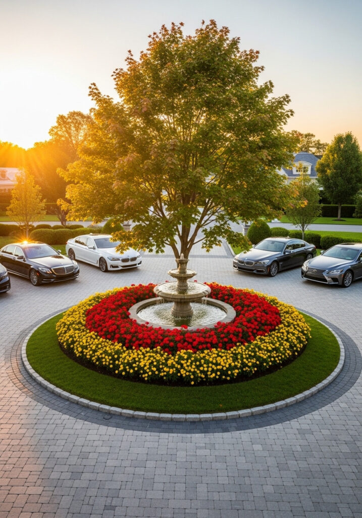 If your driveway has a circular or large turnaround, adding a landscaped island creates a stunning focal point. Plant a tree, fill it with flowers, or add a fountain for maximum effect. It adds greenery without sacrificing functionality.