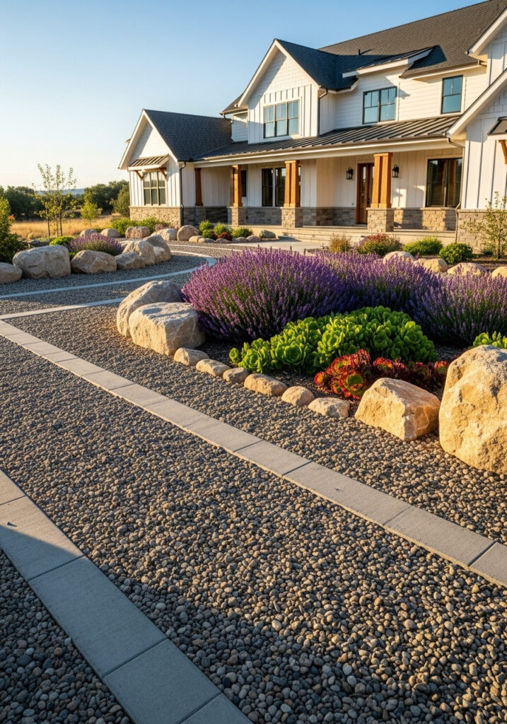 Mixing gravel with concrete or pavers creates texture and cost savings. Gravel driveways edged with stone or combined with paver strips provide a rustic yet functional look. Proper installation ensures drainage and long-term durability.