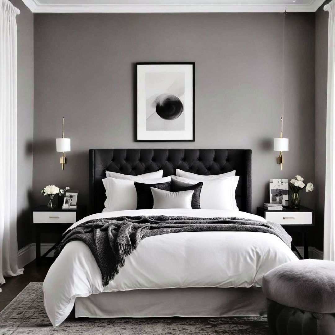 Turn your bedroom into an artistic haven by using black and grey as your canvas. Bold, abstract wall art and unique sculptures can make the space visually stunning, while creative bedroom lighting and a gallery wall of black and white photos can add a personal, artistic touch. This style is perfect for those who want to express their creativity and individuality through their bedroom decor.