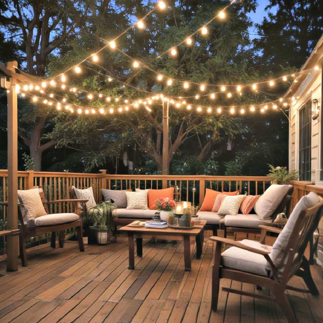 Fairy lights have a way of enchanting and captivating, transforming your deck into a whimsical wonderland. These delicate, twinkling lights can be effortlessly woven through railings, plants, or architectural features to create a dreamy, ethereal ambiance that’s sure to delight. Perfect for adding a touch of magic, fairy lights can elevate your deck’s aesthetic appeal while creating a sense of enchantment.