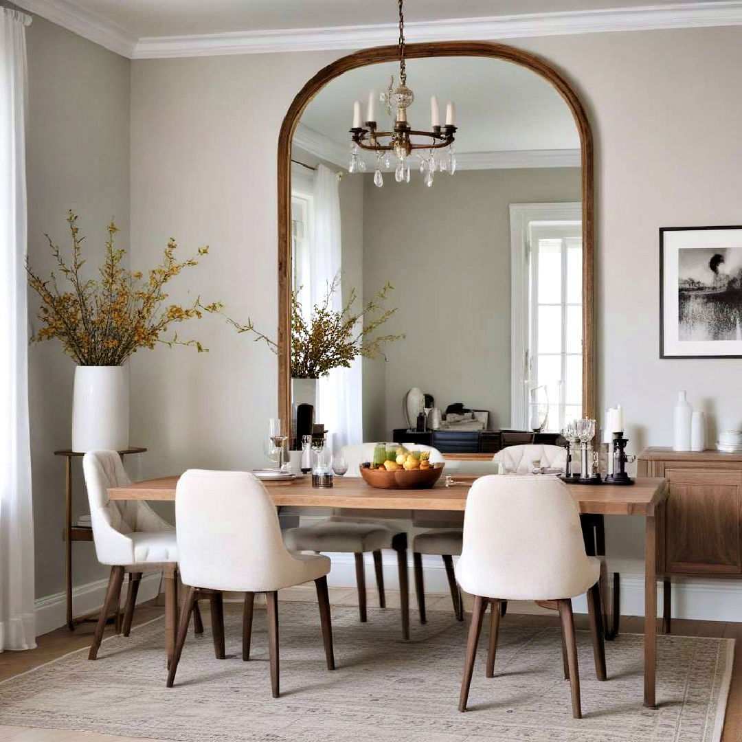 Curved mirrors have the power to transform your dining room into a visually striking space that combines functionality with architectural interest. By incorporating a large or small arched mirror, you can soften the room’s overall aesthetic while creating a cohesive look that ties in with windows, doorways, or other design elements. The curved top helps to create a sense of height and elegance, making it perfect for rooms that need a touch of drama and sophistication.