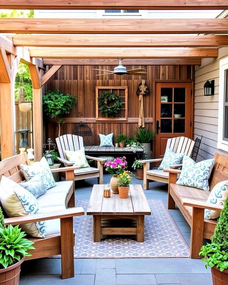 Explore country rustic patio ideas to create a warm, inviting outdoor area with natural materials that tell a story. An outdoor farmhouse table invites family and friends to gather for meals in a relaxed, open-air setting that’s reminiscent of simpler times. Opt for a sturdy, wooden table with a raw, unfinished look to capture the essence of rustic living, then complement it with mismatched chairs or benches to add a casual, lived-in feel. The large surface area of this table is perfect for outdoor feasts, and you can elevate its charm with various dining table decor ideas that reflect your personal style.