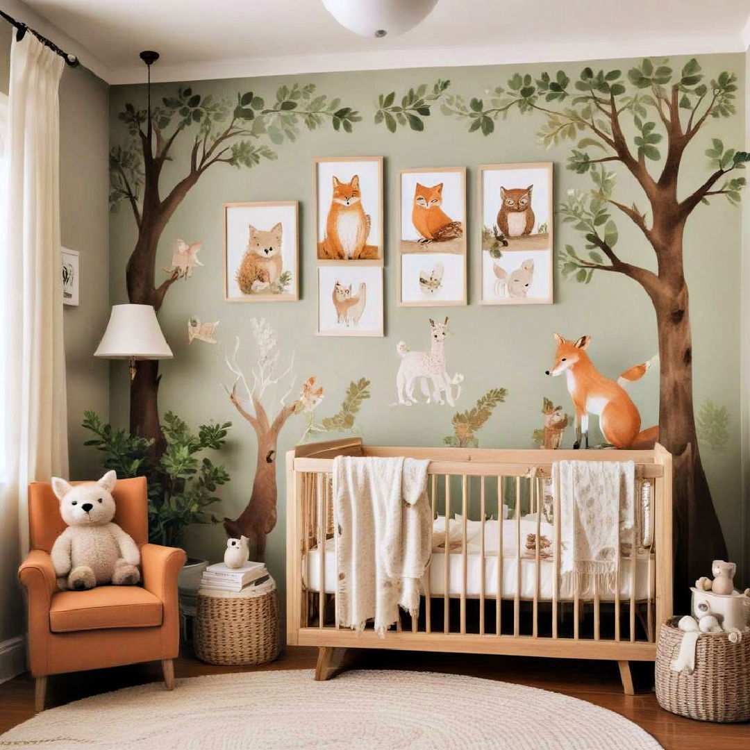 Imagine a nursery where the soothing atmosphere of a forest comes alive through gentle greens, earthy tones, and soft browns. Friendly woodland creatures like rabbits and hedgehogs can take center stage on walls and shelves, surrounded by plush toys and nature-inspired accents. Cozy blankets, wooden toys, and serene artwork bring a sense of calm to the space, perfect for fostering a nurturing environment that feels connected to nature’s gentle beauty.