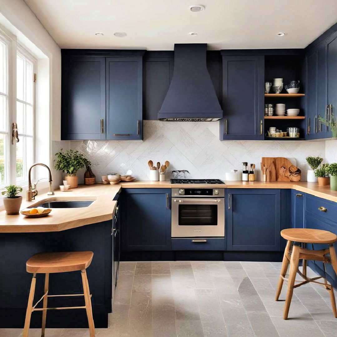 Combining navy blue upper cabinets with wooden lower cabinets can create a visually appealing balance of styles. The natural texture and warmth of the wood complement the depth and style brought by the navy blue hue. This pairing results in a charming yet modern kitchen look, reminiscent of the impact of dark grey walls in living spaces.