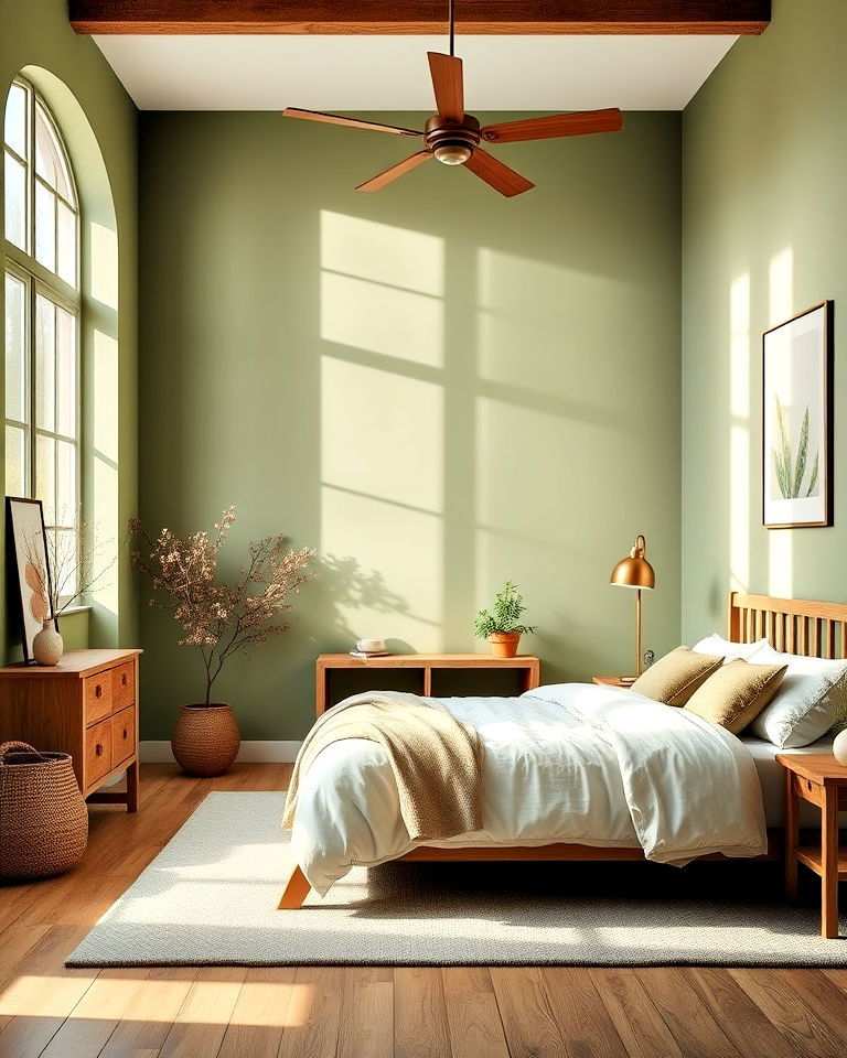 Incorporating olive green planters and natural elements enhances the organic, nature-inspired feel of the bedroom.