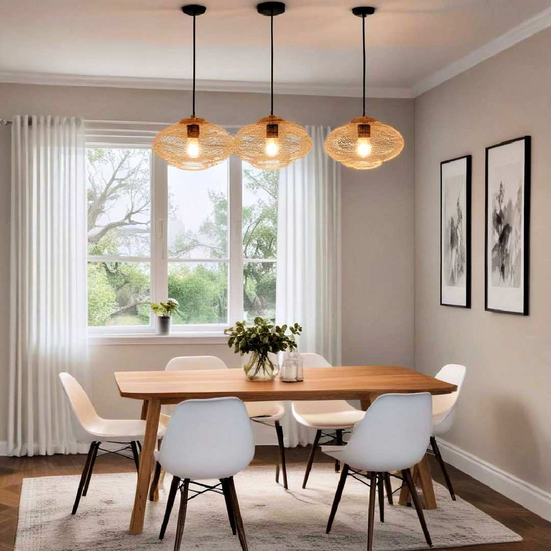 Elevate your dining area’s décor with the warm, organic charm of basket lights. Crafted from natural materials like bamboo, rattan, or wicker, these fixtures bring a sense of whimsy and coziness to the room. By providing soft, diffused lighting, they subtly enhance the atmosphere without overwhelming the senses, creating a delightful ambiance that’s perfect for casual gatherings.