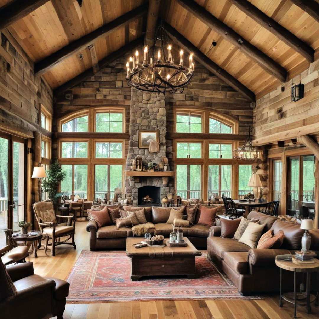 Leather furniture brings a touch of rugged sophistication to any log cabin interior. Not only is leather durable and long-lasting, but it also develops a rich, earthy patina over time. Paired with living room design ideas, leather sofas and chairs create a balanced and inviting look that perfectly complements the natural wood elements.