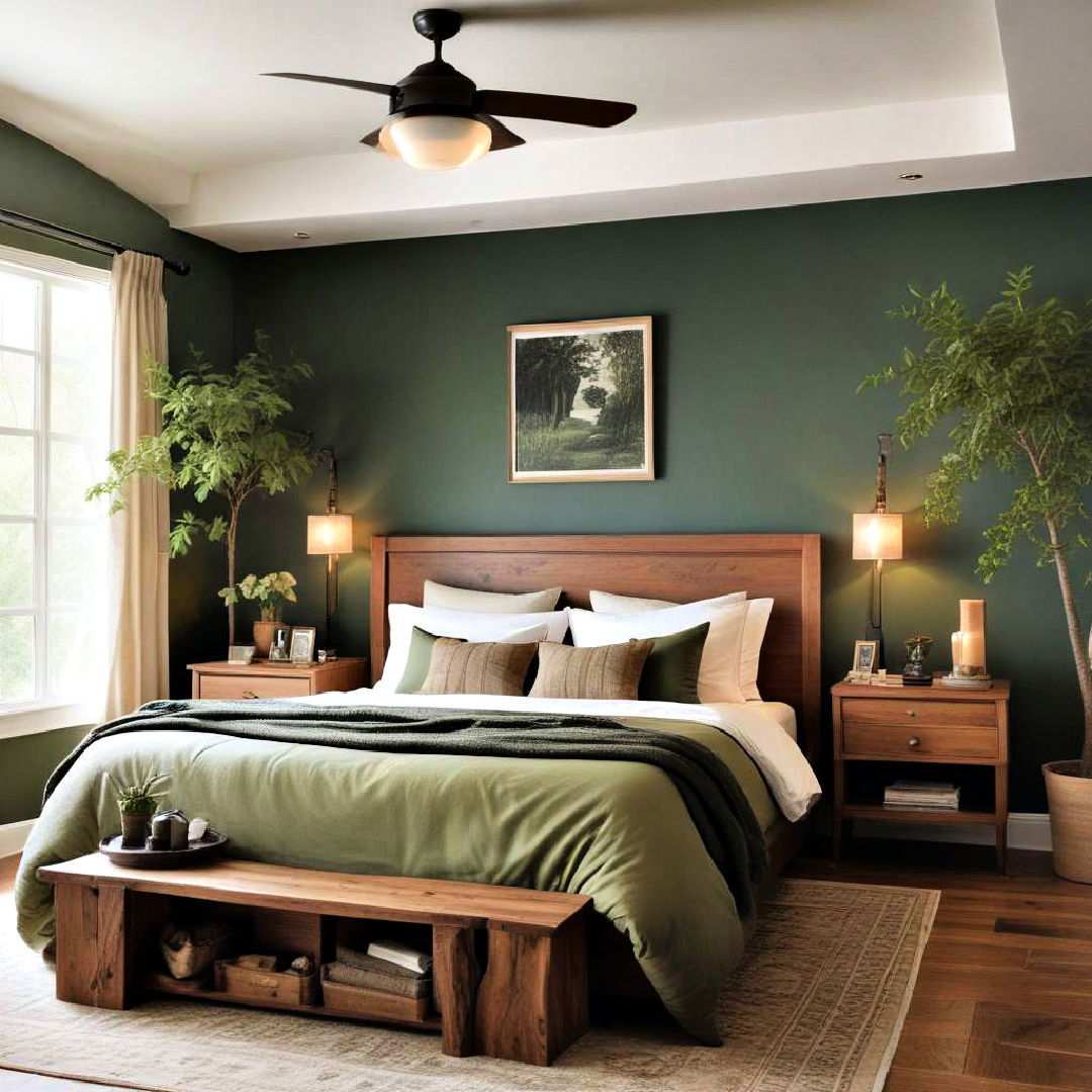 Blend the depth of dark green with the warmth of rustic decor through distressed wood, vintage treasures, and soft, romantic lighting. This enchanting combination crafts a bedroom that’s a cozy, intimate retreat, perfect for those who adore a mix of old-world charm and natural tranquility.