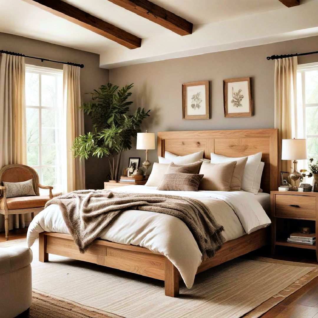 Wooden beams can be a defining feature in your bedroom, adding an architectural element that enhances the natural feel of the space. Whether structural or decorative, exposed wooden beams bring a rustic elegance to the room, complementing a variety of earthy elements and adding character and warmth.