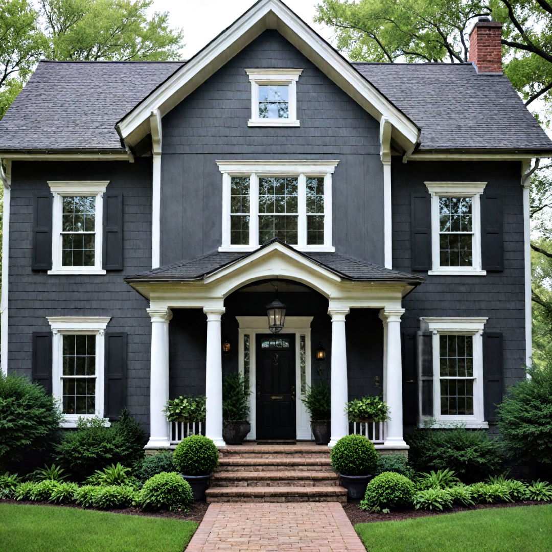 Elevate your home’s appearance with modern grey exterior house colors that make a bold statement. Graphite Gleam boasts the deep, lustrous quality of graphite, imbuing your home with a sense of warmth and elegance. This rich shade is perfect for those wanting to combine classic charm with a hint of drama, and its reflective quality plays beautifully with lighting, giving your home a vibrant yet cozy appeal, especially at dusk.