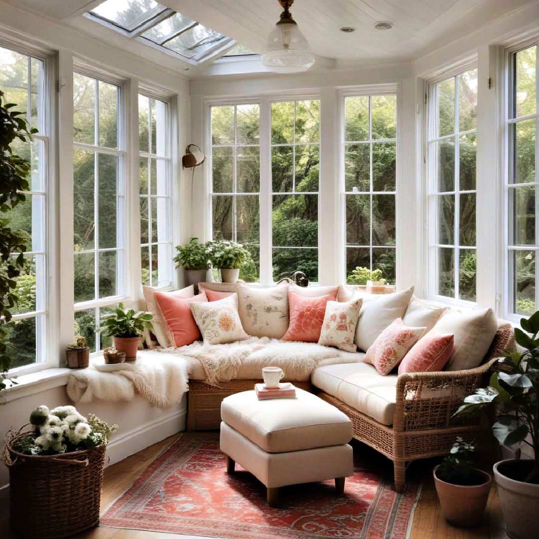 Transform your sunroom into a serene meditation space. Employ soothing colors, plush cushions, and a meditation mat. Introduce elements like incense, candles, and a small water feature to create a calming ambiance. The natural light and tranquil setup provide a perfect environment for relaxation, mindfulness, and self-reflection.