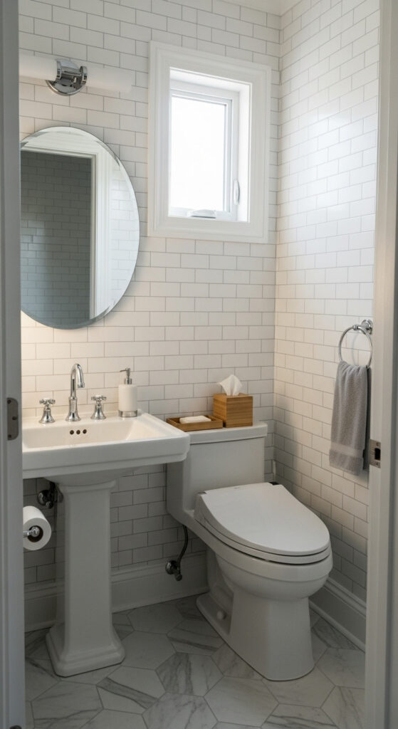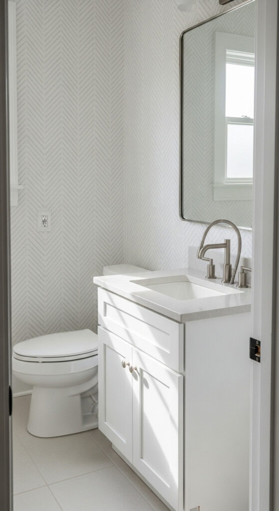 Subway tile wallpaper gives that clean, timeless look without grout maintenance. It’s perfect for tight powder rooms because white tile patterns reflect light and visually expand the space. Choose a matte, scrubbable finish that can handle splashes by the sink. Add a polished chrome faucet, a petite pedestal or console sink, and a thin-framed mirror to keep things crisp. If you want warmth, bring in a light oak vanity tray, soft gray towels, and a woven wastebasket. The look stays calm, bright, and easy to clean.