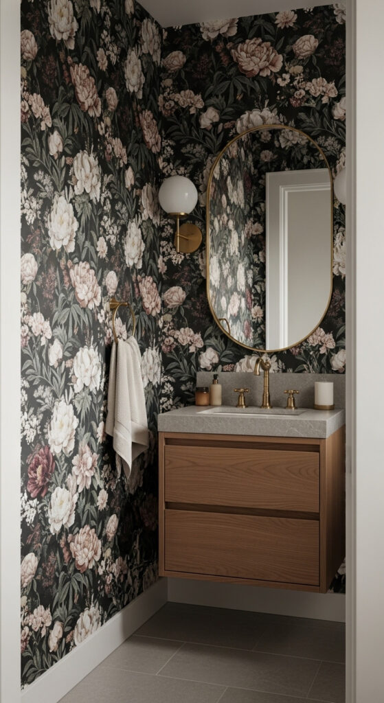 Florals don’t have to be sweet. Go moody with inky backgrounds—charcoal or midnight blue—and blooms in dusty rose, burgundy, and ivory. In a small half bath, this creates drama without overwhelming the rest of the house. Pair with a brass-framed mirror, unlacquered or aged-brass faucet, and a rich wood vanity. Keep accessories minimal so the pattern shines. A single sconce with opal glass adds a soft glow that flatters the wallpaper’s deep tones.