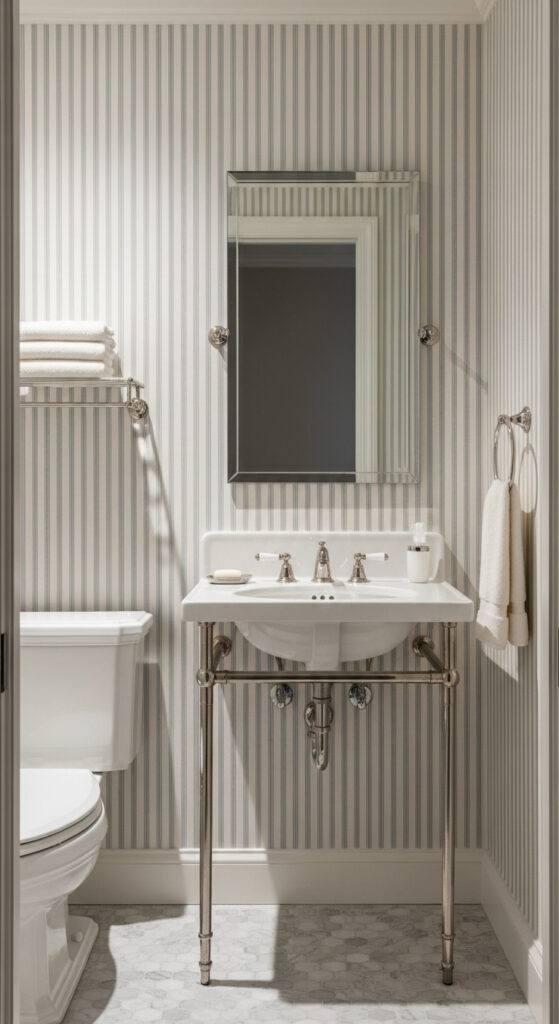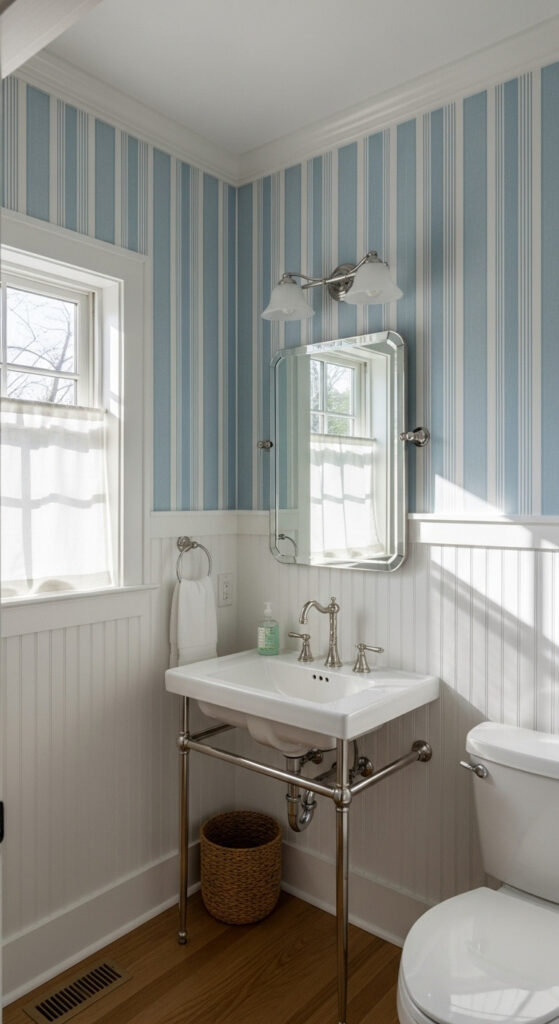 Stripes are crisp, cheerful, and easy to style. In a half bath, vertical stripes add height, while soft blues, sandy beige, and white keep things breezy. Choose a medium stripe so it’s readable in a small footprint. White beadboard on the lower third adds durability and breaks up the pattern. Nickel fixtures, woven baskets, and a simple white shade complete the coastal mood—fresh without leaning nautical.