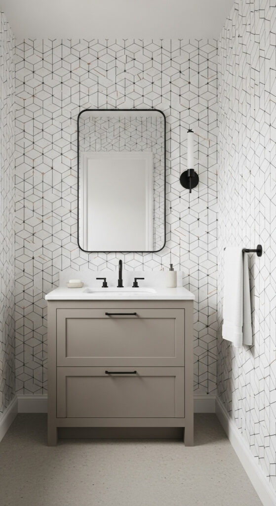 A strong geometric pattern delivers modern punch in a tiny room. Think hexagons, bold chevrons, or interlocking arcs in two or three colors max—charcoal, white, and a soft accent like clay. Use flat-front vanity doors, a single-hole faucet, and a minimalist mirror to keep the look intentional, not busy. Matte black hardware anchors the palette and adds contrast.