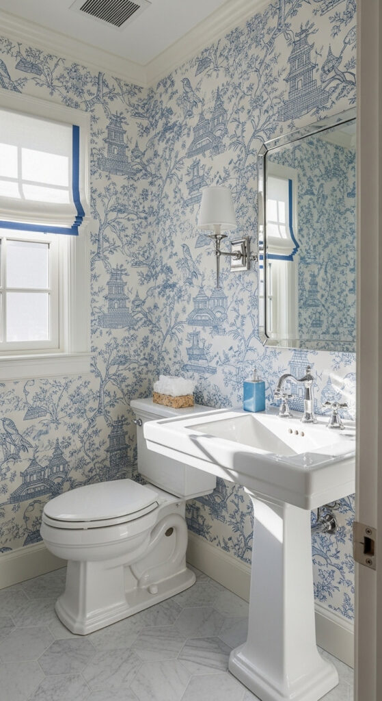 Chinoiserie adds polish and old-world charm. In a half bath, the blue-and-white palette feels crisp and timeless. Choose fine linework and keep fixtures classic: chrome cross handles, a white pedestal sink, and a beveled mirror. A small roman shade with blue piping ties it together. The result is elegant, not fussy—and it fits both traditional and transitional homes.