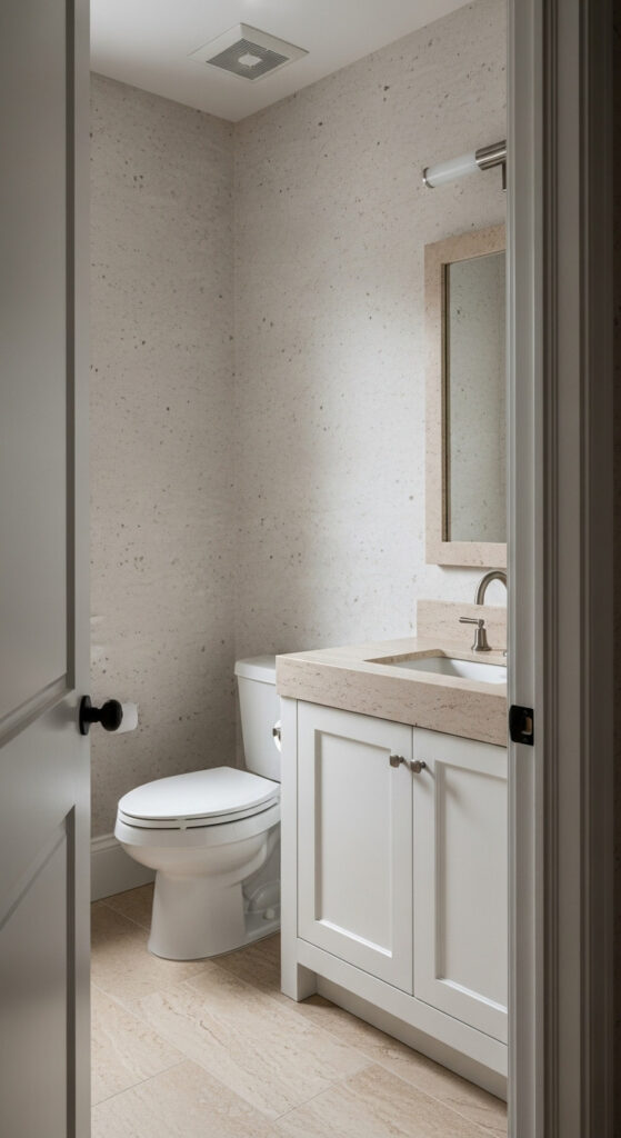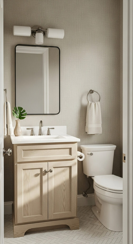 If you want warmth without print, linen-texture wallpaper brings subtle depth and hides scuffs better than paint. Choose greige, stone, or warm ivory. It makes a tiny powder room feel like a finished room, not an afterthought. Pair with a pale oak vanity, brushed nickel or chrome, and a slim profile mirror. Keep art simple—one black-and-white print is enough.