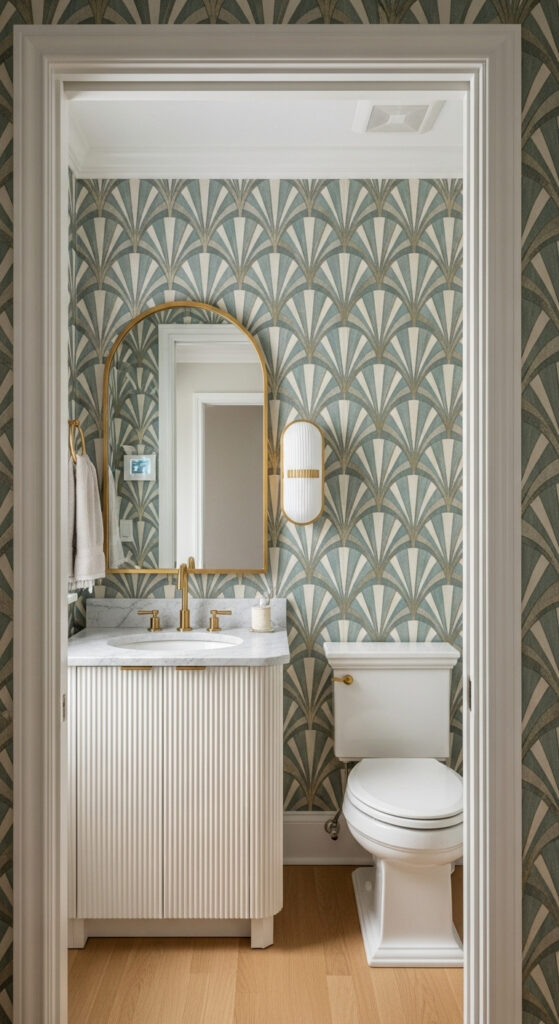 Art Deco scallops/fans add glam in small doses. Choose cream and gold on a soft colored ground—dusty teal or ink blue. A petite marble top vanity, fluted details, and a ribbed glass sconce echo the era without going theme-park. Keep the ceiling and trim bright white so the pattern pops but the room still feels airy.