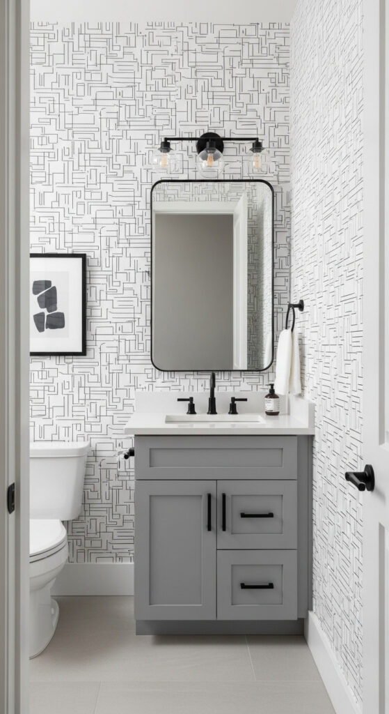 Black-and-white linework reads graphic and chic in a small powder room. Choose an abstract scribble, micro-grid, or hand-drawn motif. Keep everything else streamlined: slab vanity doors, black hardware, a simple metal frame mirror. A single piece of modern art, also black-and-white, completes the gallery vibe.