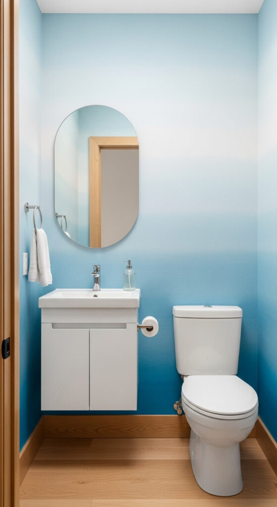 A watercolor ombre wall eases from light to mid-tone, adding depth without busy pattern. In a windowless powder room, a sky-to-sea blue gradient softens edges and makes the space feel taller. Choose simple chrome fixtures and clear glass accessories to keep the room light and airy. Great with white or pale oak accents.
