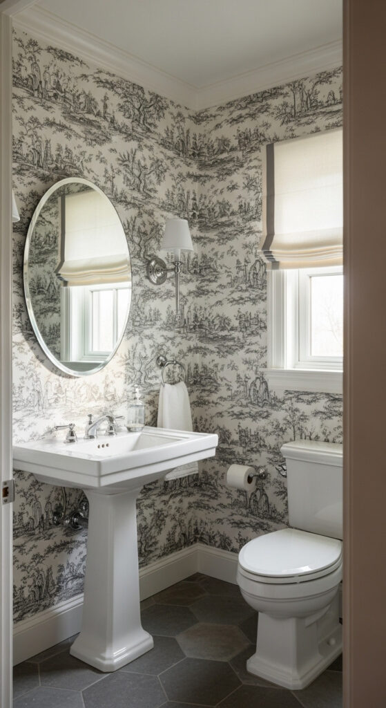 Toile gives instant “collected” charm. Pick a single-color print—navy, charcoal, or forest—on ivory to keep it refined. In a small space, balance the narrative pattern with simple fixtures: pedestal sink, chrome, and one classic sconce. A ribbon-trimmed roman shade or a single monogrammed hand towel adds that tailored note.