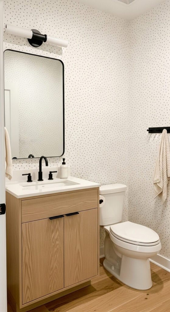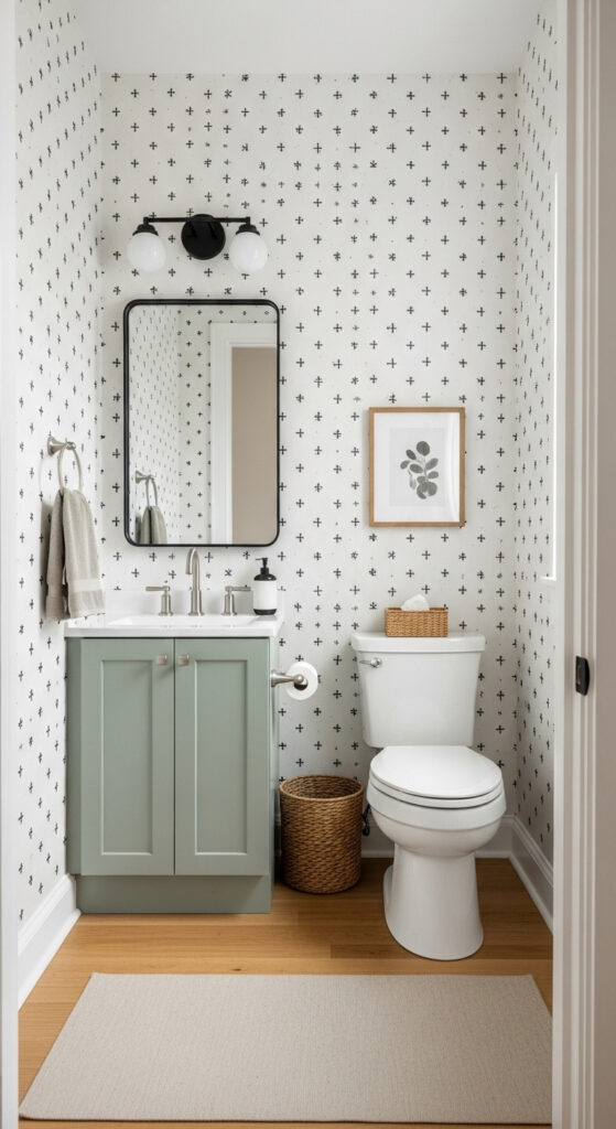 A micro-pattern—tiny sprigs, dots, or crosses—adds personality without crowding a small room. Choose a warm white ground with soft charcoal, slate, or nutmeg marks. It’s forgiving, wipes clean, and works with almost any metal finish. Keep the vanity color solid and introduce texture with a woven wastebasket or ribbed towel.