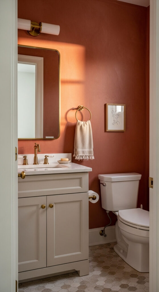 If your home skews earthy, a terracotta plaster-effect wallpaper brings warmth and depth. It pairs beautifully with stone counters, aged brass, and cream linens. In tight quarters, a textured print reads sophisticated and hides small scuffs. Keep trim bright white for contrast and clarity.