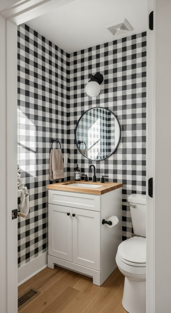 Black-and-white or gray-and-white plaid brings order and a slightly farmhouse note. It’s great with butcher-block accents, matte black hardware, and a schoolhouse light. Choose a medium scale so the pattern isn’t dizzying in a compact space. Keep towels and accessories neutral for balance.