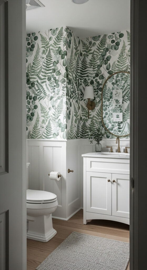 Leafy greens bring life to windowless powder rooms. Look for layered ferns and eucalyptus in tonal greens on a soft white ground. Brass or black fixtures both work; wood accents keep it grounded. If you’re pattern-shy, apply it above a chair rail or beadboard to dial down the impact.