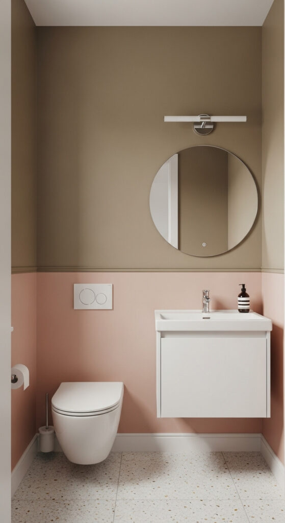 Prefer color over pattern? A color-block wallpaper in two harmonizing tones (think clay and blush, or ink and smoke) gives architectural structure without busy motifs. Align the transition to echo the height of the mirror or top of the vanity for a built-in feel. Pair with a minimalist faucet and slim lighting.
