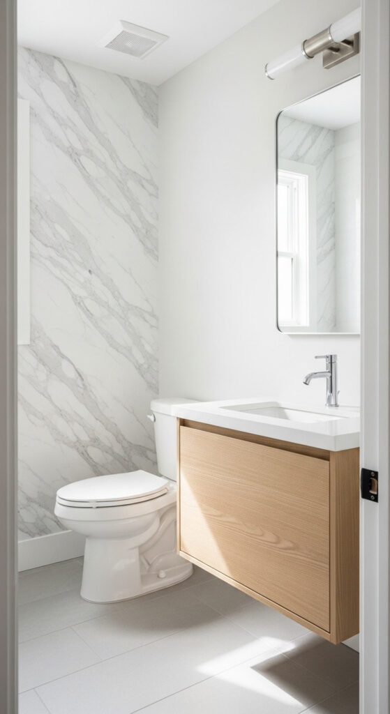 Get the luxe marble look without slab costs. A marble-effect wallpaper in subtle gray veining adds instant sophistication. Keep fixtures streamlined and let the “stone” wall be the star. Pair with chrome or black, and use simple white linens. Great for modern or transitional homes.