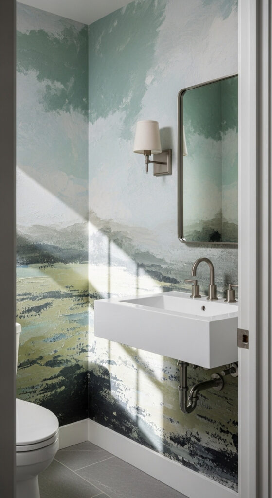 A mural-style wallpaper turns a tiny powder room into a jewel box. Choose soft, painterly landscapes or abstract washes in calming tones—misty greens, stone, and sky. Keep fixtures simple and let the walls carry the story. One well-placed sconce and a quiet mirror frame are enough.