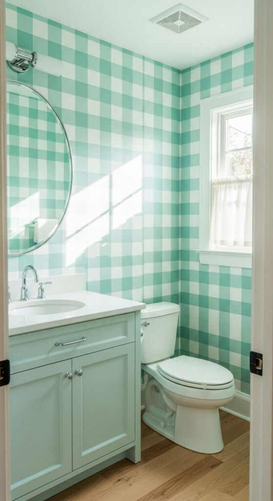 Pastel gingham brings cheer without shouting—mint, powder blue, or butter yellow. The check reads clean and classic in tiny rooms. Match vanity paint to the lightest square for a layered look, then keep everything else white and simple. A café curtain or roman shade adds sweetness.