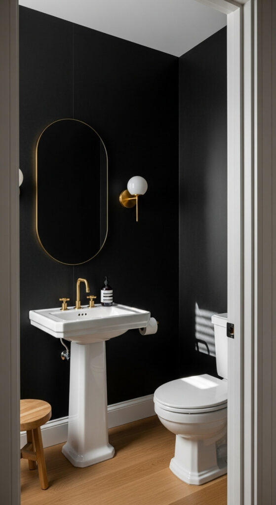 A deep, velvety black wallpaper can make a tiny powder room feel like a chic studio set—especially with high-contrast white fixtures. The key is texture: look for a soft, almost chalky matte. Add a brass mirror and warm wood accents to keep it welcoming. This look photographs beautifully and feels high-end.