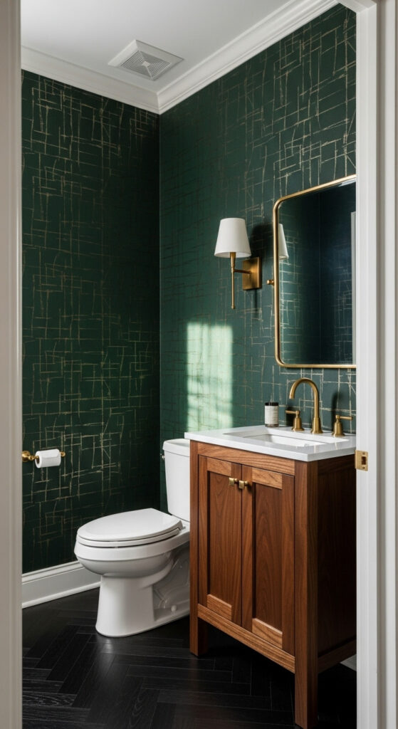 A half bath is the perfect place to take a risk. It’s small, often windowless, and doesn’t have a shower’s steam, so you can go bold with pattern and color. The right wallpaper turns a simple powder room into a moment—something your guests will remember and you’ll enjoy every day. Below are half bath wallpaper ideas that balance style with practicality: wipeable finishes, smart color choices, and patterns that make tight spaces feel thoughtful, not crowded. Each section includes a ready-to-use, ultra-realistic image prompt tailored for half baths, with natural morning/noon light, true shadows, and a 10–15 m camera distance that captures fixtures and details—no people or animals.