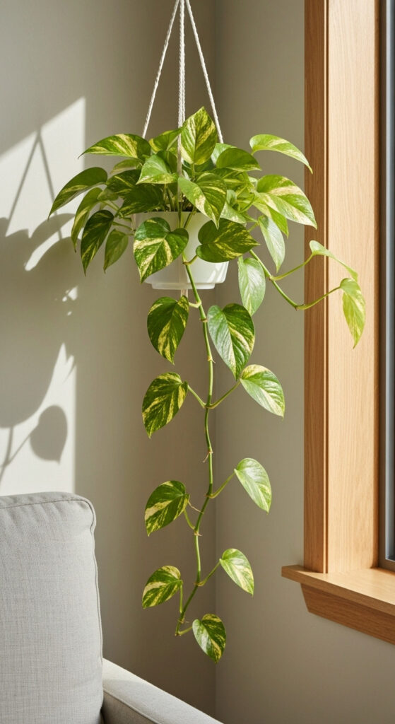 Golden pothos is the classic “forgives a miss” hanging plant. Heart-shaped leaves marbled in green and warm yellow tumble on easy vines that look lush in almost any room. Bright, indirect light keeps variegation strong, but average living-room light a few feet from a window still works. Water when the top inch of soil is dry and feed lightly in spring and summer. If the center thins, coil a few cuttings back onto the surface so they root and thicken the crown. Style it in a simple white or terracotta pot to let the leaf pattern lead, and place it where the cascade can frame art, a window, or a bookcase edge without blocking views.