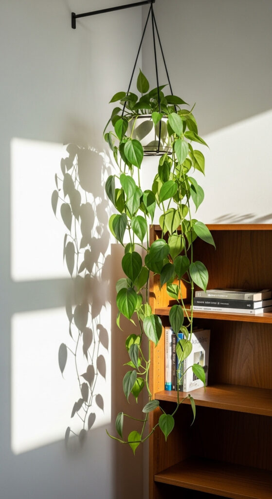 If you want a softer, moodier look, heartleaf philodendron delivers a velvety drape of deep green hearts. It thrives in bright, indirect light but keeps its color in medium light, which makes it perfect near bookshelves or a north window. Water when the top inch dries; keep the mix airy so roots breathe. Pinch tips to encourage branching and rotate the pot weekly so vines don’t lean toward the window. For a polished finish, loop one or two stems around a simple brass hoop tucked at the rim—your cascade will gain height and a gentle, tailored curve without losing that relaxed feel.