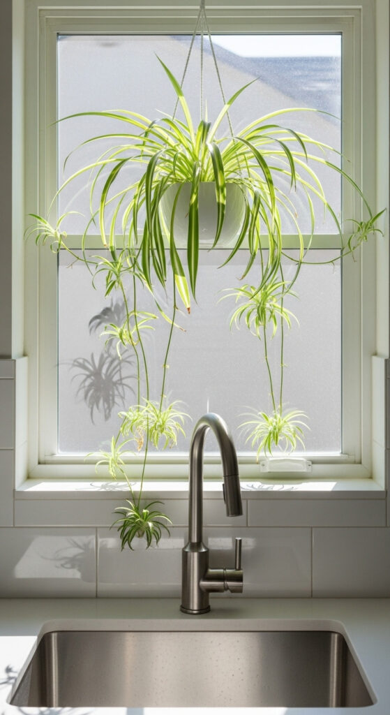 Few plants add as much lively movement as a spider plant in a hanging bowl. Long, arching blades spill outward while baby “spiderettes” dangle like a mobile—great over a kitchen sink, stair landing, or sunny hallway. Give bright, indirect light and let about half the pot dry between waterings. Brown tips usually signal hard water or extra fertilizer; switch to filtered water and trim with clean scissors for a neat edge. Snip a few plantlets and root them in water to refresh the pot or share with friends. A low, wide planter keeps the silhouette graceful and prevents a top-heavy look.