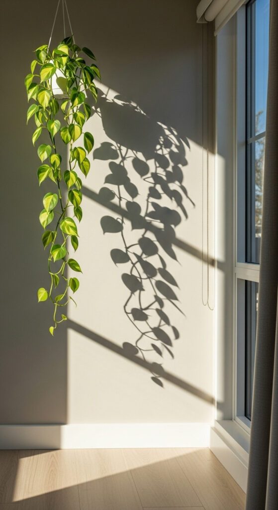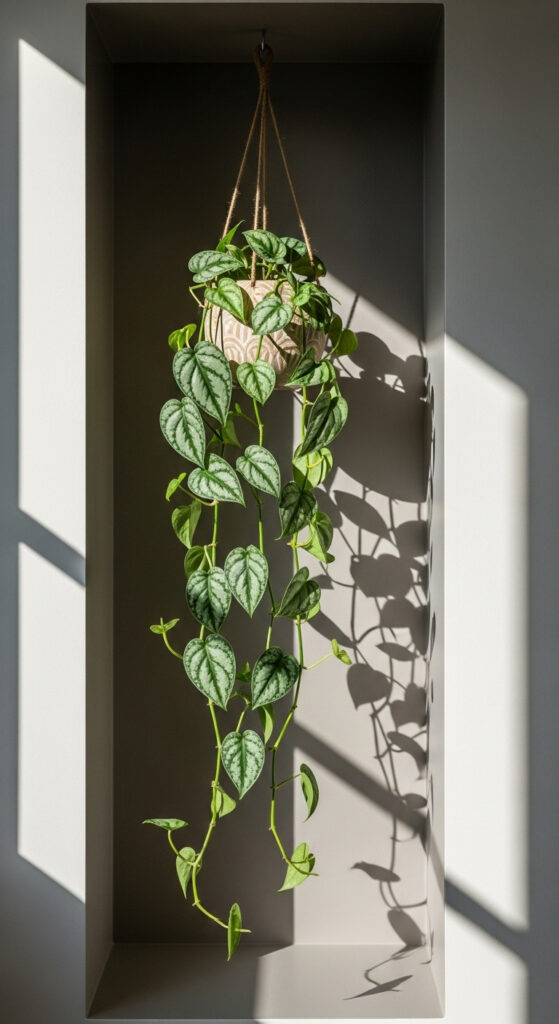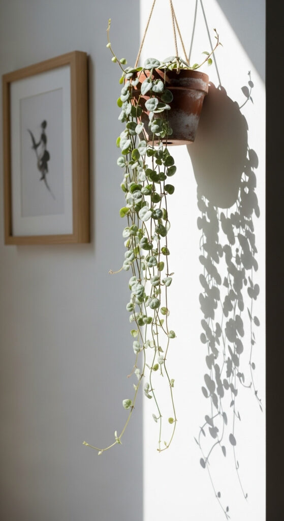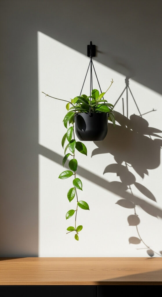 Hoya offers a glossy, sculptural contrast to ferns and trailers. Thick, semi-succulent leaves ride long tendrils that eventually carry star-shaped clusters of blooms on mature plants. Provide bright, indirect light and a chunky, breathable potting mix (soil with bark chips and perlite). Water deeply, then allow the mix to dry most of the way before the next soak. Don’t cut bare “searching” tendrils—new leaves and blooms form there. Hang it where those looping lines can read like living artwork, ideally near a window that backlights the sheen.