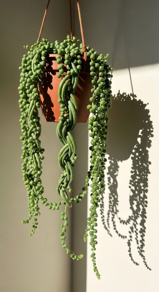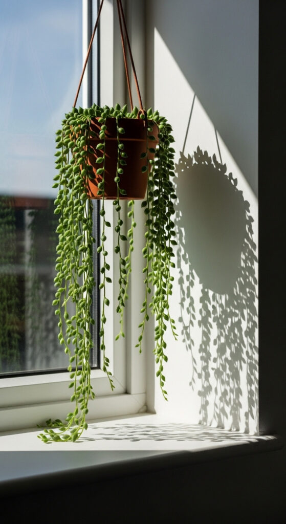 This sculptural succulent looks like a beaded curtain. It asks for lots of bright, indirect light (gentle morning sun is fine) and a gritty, fast-draining mix so water runs through quickly. Soak the pot, then wait until the soil is bone dry before watering again. Avoid misting—pearls rot if they stay wet. Hang it where people won’t brush by, since the strands are delicate. The payoff is a graphic cascade that makes even a simple shelf look styled.