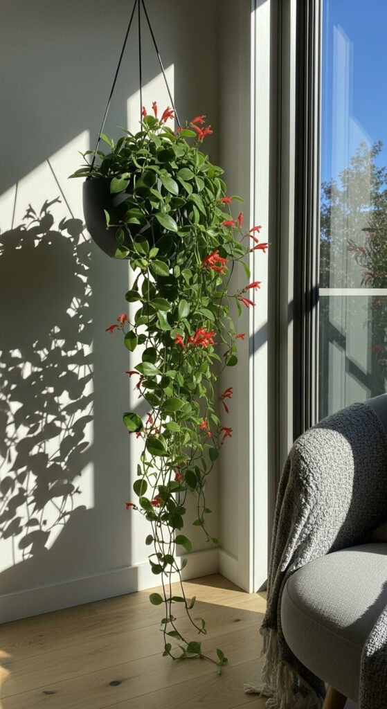 For color without a florist’s arrangement, go with lipstick plant. It carries glossy leaves on arching stems and sends out red tubular blooms that pop against neutral walls. Place in bright, indirect light and keep the soil lightly moist—think evenly damp, not soaked. Shear lightly after a big bloom flush to keep the crown tight and encourage fresh trailing growth. Hung near a patio door or in a living room, it adds a clean burst of color while staying tailored.