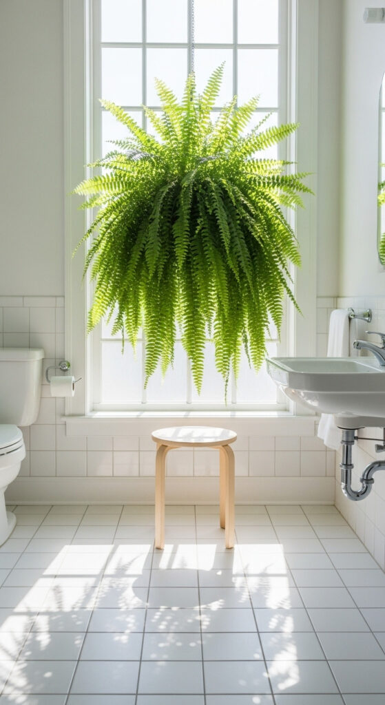 Boston fern brings soft, arching fronds that round off hard corners and make the air feel fresh. It likes bright, indirect light and higher humidity, which is why it excels in a bathroom with a window. Keep the soil evenly moist, trim older fronds at the base, and rotate the hanger so the skirt stays symmetrical. A simple white planter highlights the frond texture and keeps the look clean rather than cottagey.