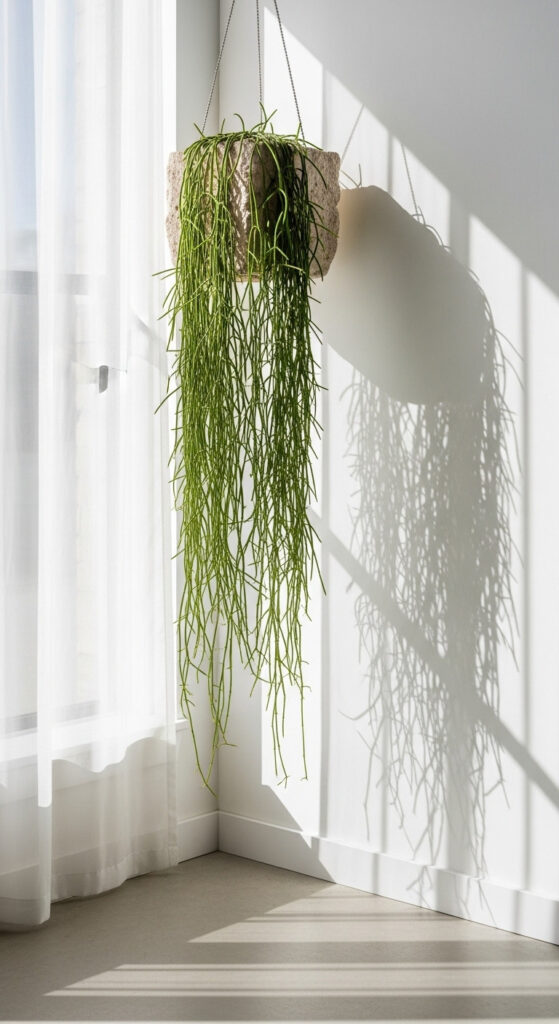 Rhipsalis is the modernist’s hanging plant. Instead of broad leaves, it forms thin, pendant stems that read like a soft green cloud—perfect for keeping groupings light. It’s an epiphyte, so use a loose, bark-rich mix, water when the top third of the pot is dry, and give bright, indirect light. Because the texture is so fine, it pairs beautifully with bolder plants, preventing a window display from feeling bulky. It’s also tidy to prune—no sticky sap, no mess—so you can keep edges sharp.