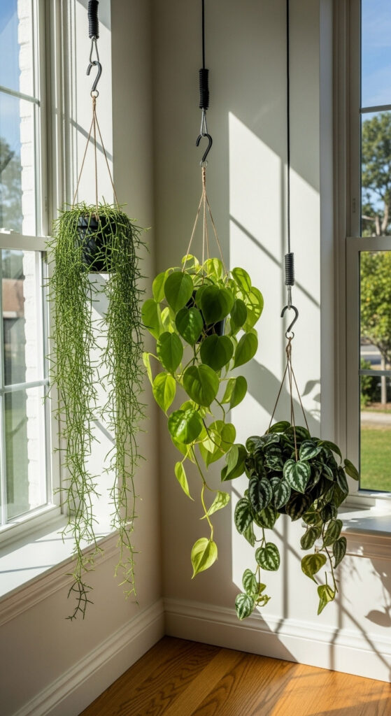 Choose anchors rated beyond the combined weight of pot, mix, and a full watering. Keep foliage 18–24 inches above head height in paths. Most trailing plants prefer bright, indirect light; a sheer curtain helps soften midday sun. Water at the sink: soak thoroughly, let it drain, then return to the hanger. Rotate a quarter turn each week for even growth, and dust leaves with a barely damp cloth so they can breathe. When grouping, mix leaf sizes—one bold, one glossy, one fine—and repeat pot finishes across the room so the display looks collected, not random.
