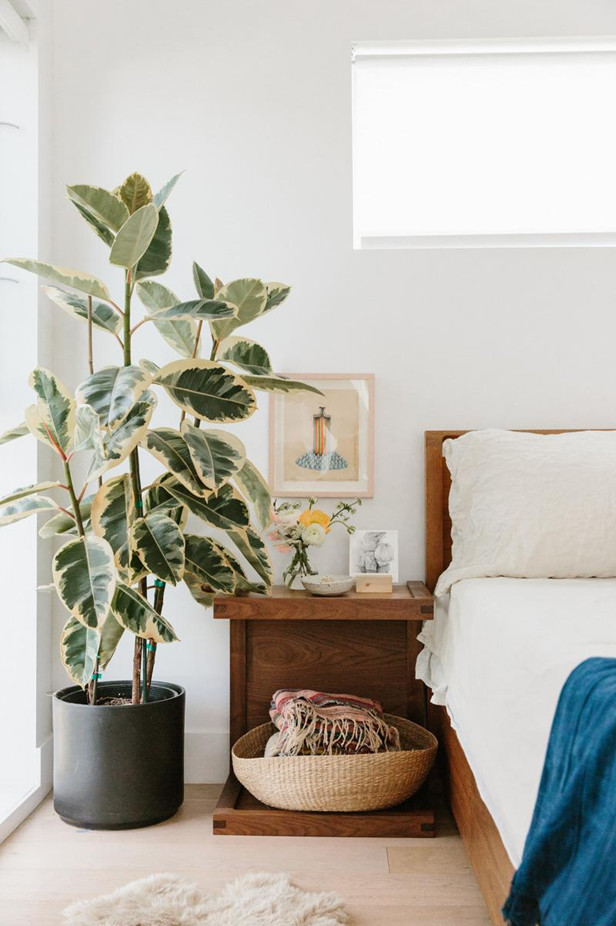 With this bedroom design concept, you can wake up to a revitalizing burst of nature. Simple accents like fresh flowers and warm textures add coziness and balance to the room, while the tall indoor plant next to the wooden nightstand fosters a serene and welcoming ambiance.